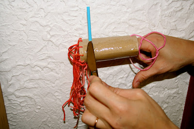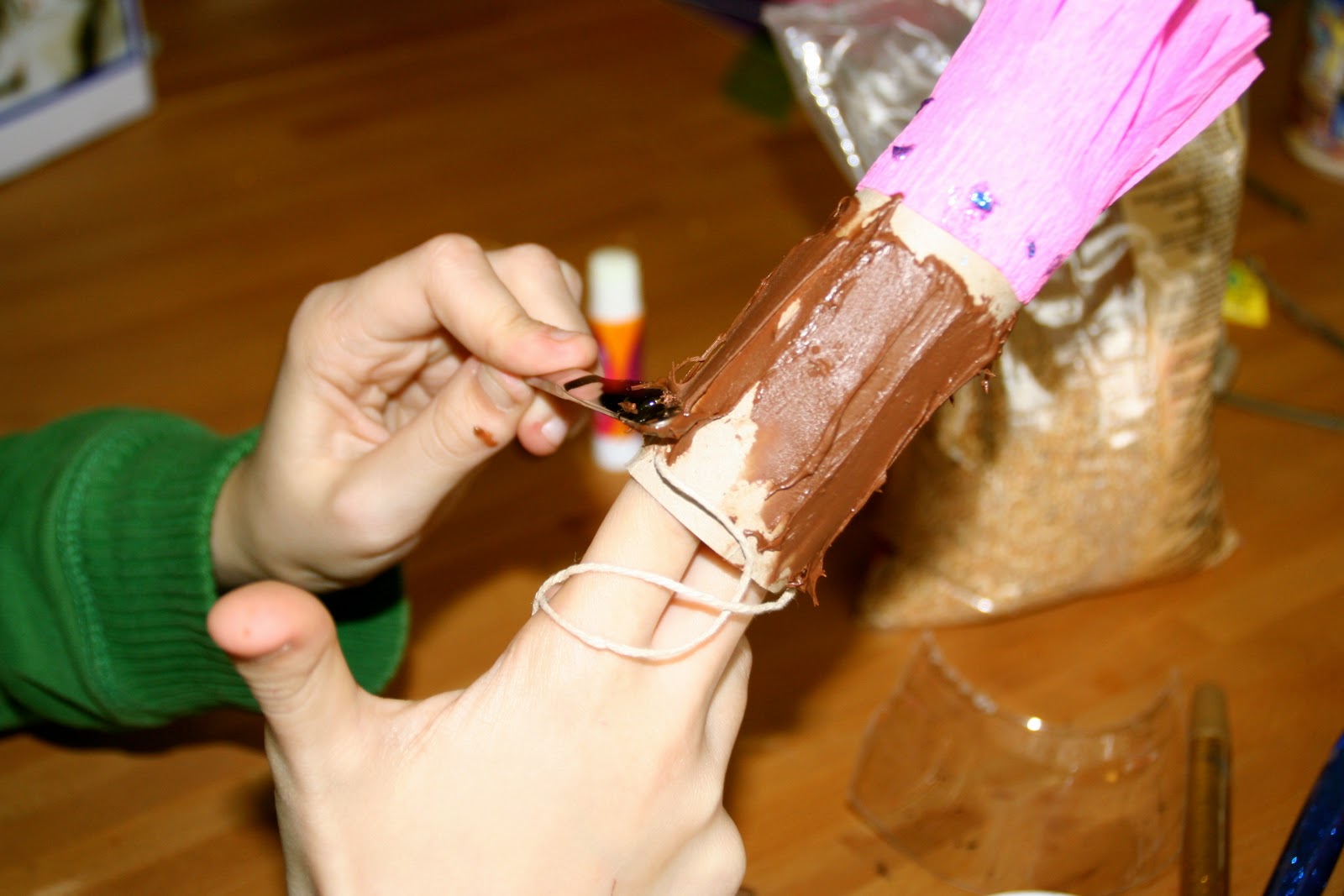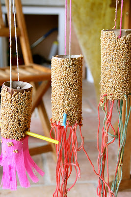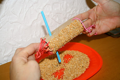 um furo de um lado ao outro na ponta do rolo sem decoração (1 dedo distância) para enfiarem um fio que permite pendurar o vosso bird fedeer